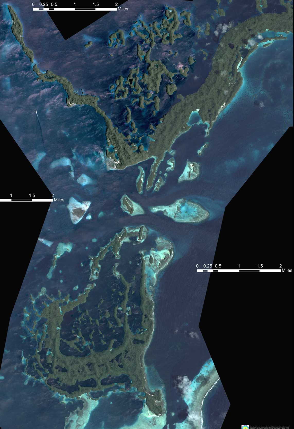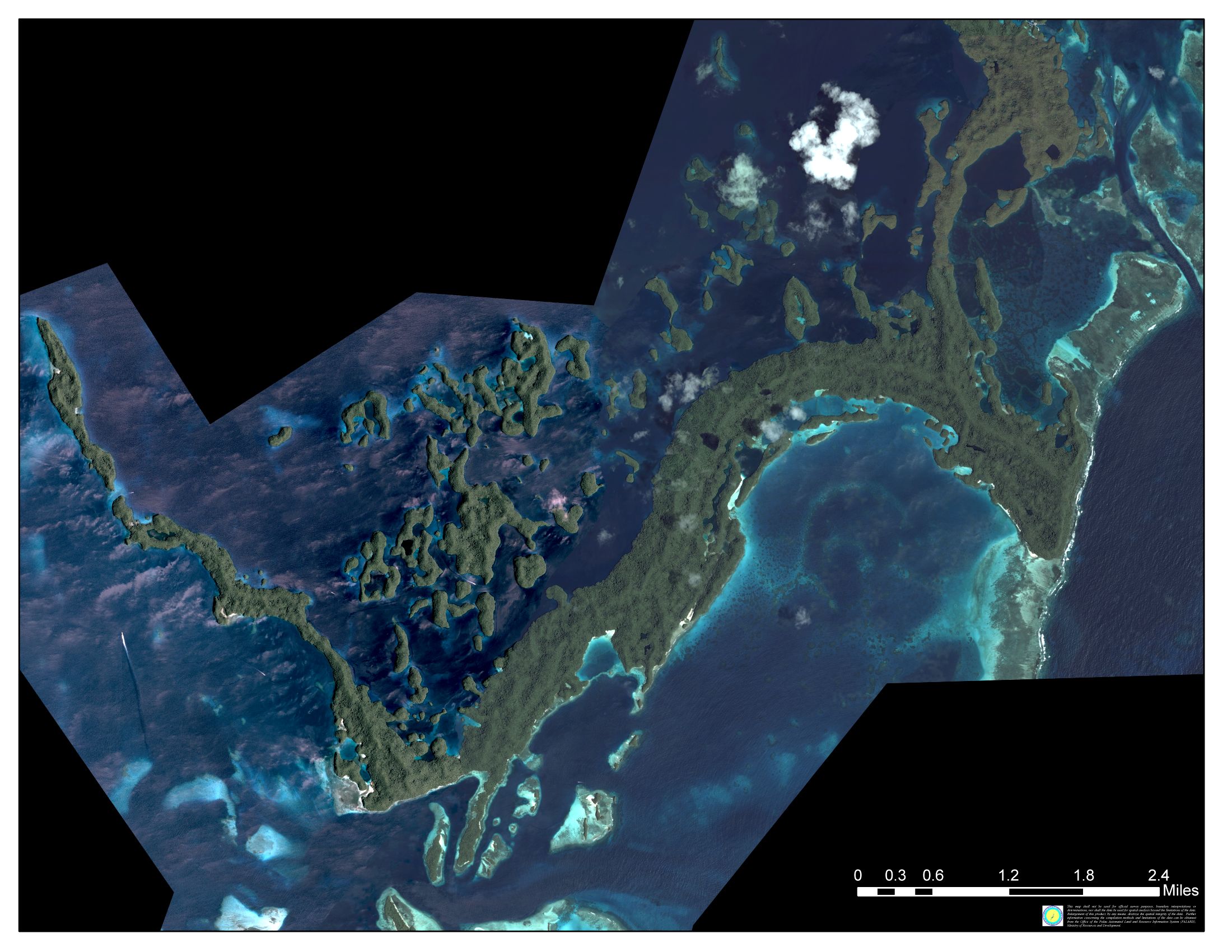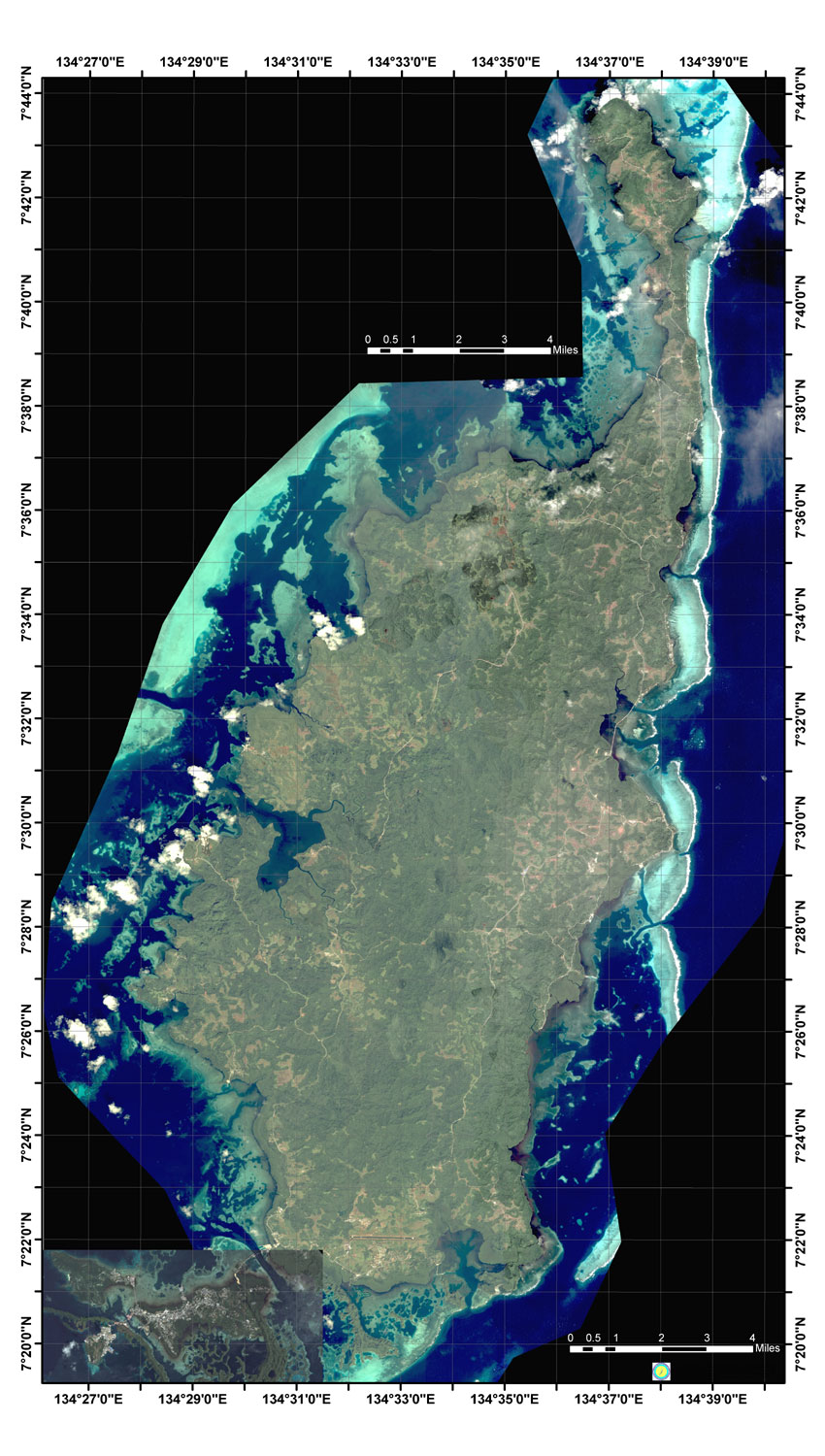 Rock Islands in detail Click here for a large pic 1100 X 1665 from just below Malakal Harbor to just north of Peleliu Saies Complex is just off the northern part (to the left) and Blue Corner complex is just off the southern part |