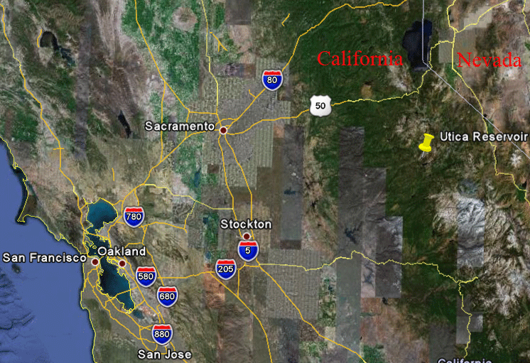 100 miles east of Stockton California Near Bear Valley at 6800 ft. elevation